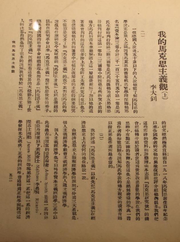 1919年,李大釗在《新青年》第6卷第5號發(fā)表《我的馬克思主義觀》一文,極大地推動了馬克思主義在中國的研究與傳播。