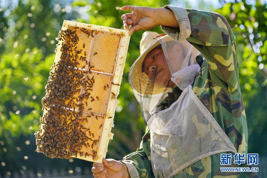 河北省唐山市豐潤區(qū)五鳳頭村百草坡現(xiàn)代農(nóng)業(yè)園區(qū)的工作人員在采集蜂蜜(6月28攝)。 新華社記者 牟宇 攝