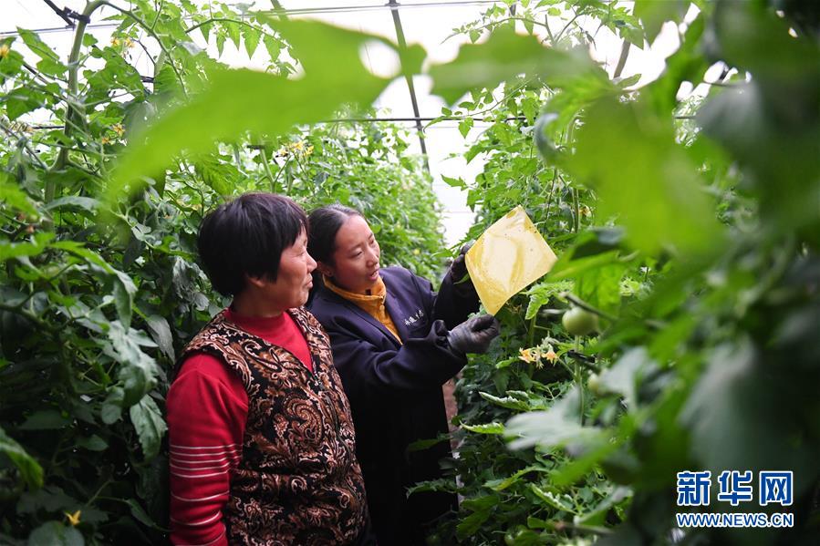 河北省唐山市樂亭縣唐山綠昕農(nóng)業(yè)發(fā)展有限公司技術(shù)人員在大棚內(nèi)指導(dǎo)菜農(nóng)病蟲害綠色防控技術(shù)(11月9日攝)。 新華社記者 牟宇 攝