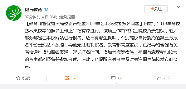 (原標題:教育部督促有關(guān)高校妥善處置2019年藝術(shù)類?紙竺麊栴})