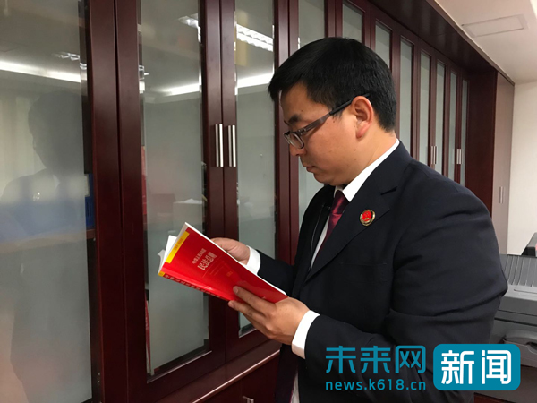 他的座椅靠背上,掛著一件衣領(lǐng)已經(jīng)磨得發(fā)舊的開襟毛衣。而在墻角,是一張簡(jiǎn)易的折疊床,用來午休和加班休息時(shí)用。在書柜中,基本都是日常需要學(xué)習(xí)參閱的法律書籍。