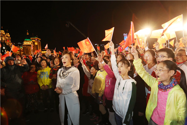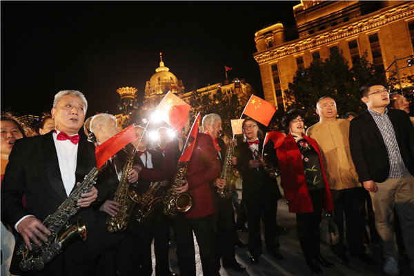 昆曲藝術(shù)家張軍、新聞主播葉蓉、和平飯店爵士樂隊、黃浦區(qū)勞模代表、春天少年合唱團(tuán)的少年們……出人意料地閃現(xiàn)在人流如梭的外灘,用不同的方式唱響《我和我的祖國》。外灘成了一片紅色的歡樂海洋:輪滑少年手執(zhí)國旗在人群前滑過,江邊和浦江游輪上的人們興奮地互相舞動著國旗,鐘樓在燈光投射下“身披”一面巨型國旗……越來越多的游人圍聚過來跟著一起高歌,人們拿出手機(jī)記錄下這一特別的時刻。歌曲結(jié)束時,歡呼聲響徹外灘!拔覑壑袊,我愛上!保⒆觽?nèi)杠S高呼。