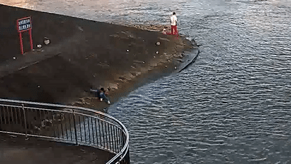 他向落水父子伸出魚竿