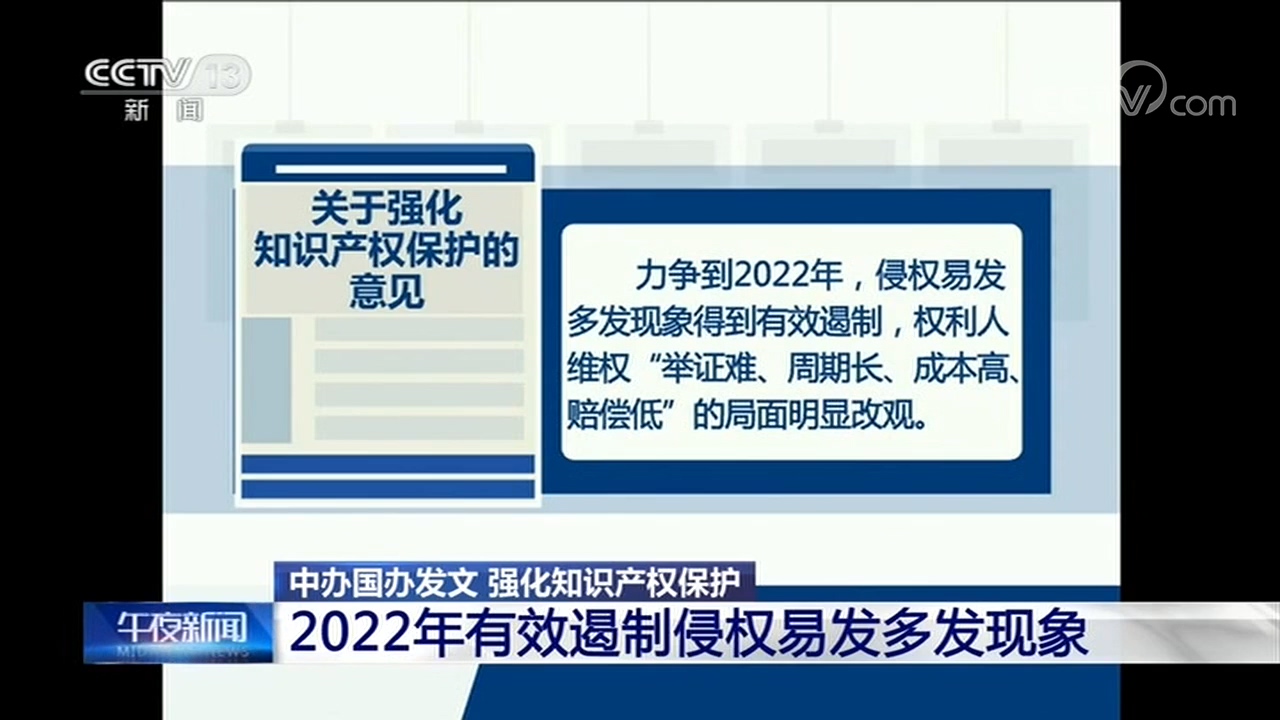 央視網消息:近日,中共中央辦公廳、國務院辦公廳印發(fā)了《關于強化知識產權保護的意見》(以下簡稱《意見》)并發(fā)出通知,要求各地區(qū)各部門結合實際認真貫徹落實。