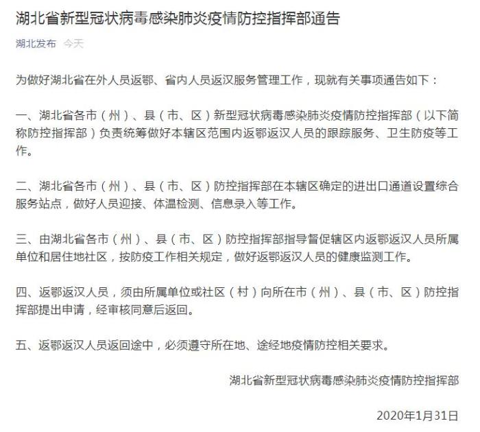 通告指出,湖北省各市(州)、縣(市、區(qū))新型冠狀病毒感染肺炎疫情防控指揮部(以下簡稱防控指揮部)負(fù)責(zé)統(tǒng)籌做好本轄區(qū)范圍內(nèi)返鄂返漢人員的跟蹤服務(wù)、衛(wèi)生防疫等工作。