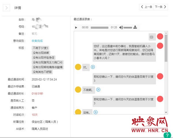 映象網(wǎng)訊(記者 陳偉然 通訊員 郝少川 孫艷麗)在抗疫一線,人工智能為社區(qū)疫情防控提效降本提供了新的思路。疫情防控進(jìn)入艱難時(shí)期,隨著復(fù)工潮的到來,更多的人員流動(dòng)給社區(qū)疫情防控排查及居家隔離監(jiān)控帶來新挑戰(zhàn)。鄭州市二七區(qū)建中街街道辦事處率先使用AI人工智能外呼平臺(tái),實(shí)現(xiàn)對(duì)居家隔離人員的二次排查、隔離監(jiān)控、宣教提醒,有效加強(qiáng)了街道疫情防控工作力量,提高了防控工作效率。