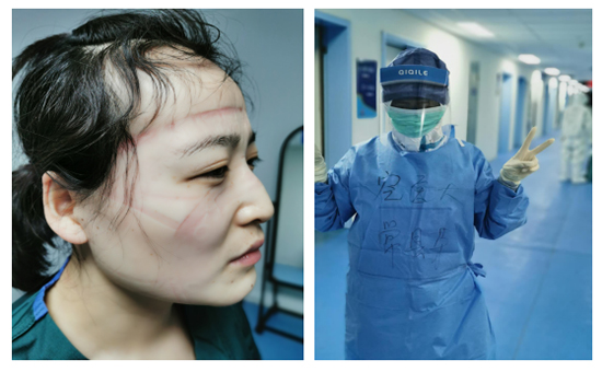 我看到有人節(jié)約防護服而盡可能不喝水,不上廁所,我看到每個人摘下口罩、護眼鏡后臉上留下的深深印痕;我看到有人被感染,甚至有人犧牲……但,這是我的職責!
