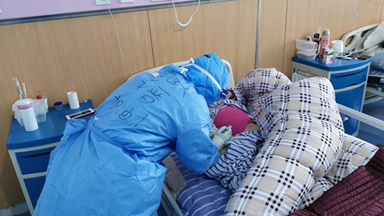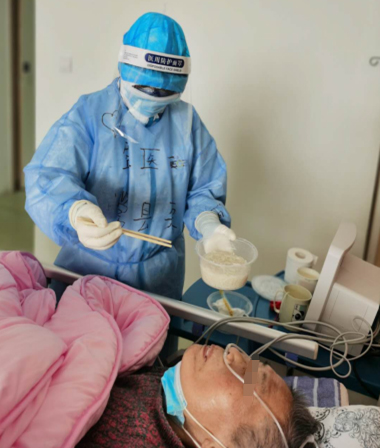 我所在的湖北婦幼保健院光谷院區(qū)感染二科是重癥科室,病人基本都是生活不能自理的老奶奶、老爺爺。除了日常的護理工作---輸液、動靜脈采血、插胃管、導尿管、檢測呼吸機、搶救病人、病房的洗消、垃圾的處理外,還要喂飯、喂藥,換尿不濕。因為語言不通(老人家說武漢方言),還要連說帶比劃,半天才能搞明白爺爺奶奶們想要表達的意思。一個班下來,渾身都是汗快要累癱了,但是耳邊老爺爺老奶奶的話語,“孩子,謝謝你”,那時候我的心里倍感欣慰,感覺渾身都是勁。