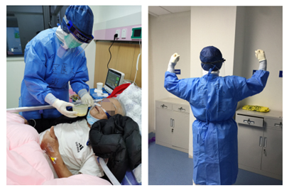 記得剛開始穿防護服進病房,小伙伴們緊張害怕,緊張自己的防護服是否嚴密包裹自己,是否有任何暴露的風險。害怕的是,因為是第一次接收病人,能否合理安排好工作秩序,能否可以和病人順利交流等諸多問題。隨著時間的推移,在摸索中一步步前進,轉(zhuǎn)眼間,一個月快過去了,我們已經(jīng)適應了穿防護服的日子,適應了每天過的跟打仗似的日子。