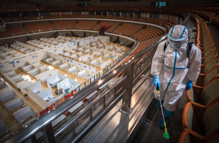 2020年3月8日,武漢體育中心方艙醫(yī)院送走最后一批痊愈患者,正式休艙。隨后,艙內將進行全面消毒工作。圖為來自河南安陽的志愿者在進行消殺作業(yè)。新華社記者 肖藝九/攝