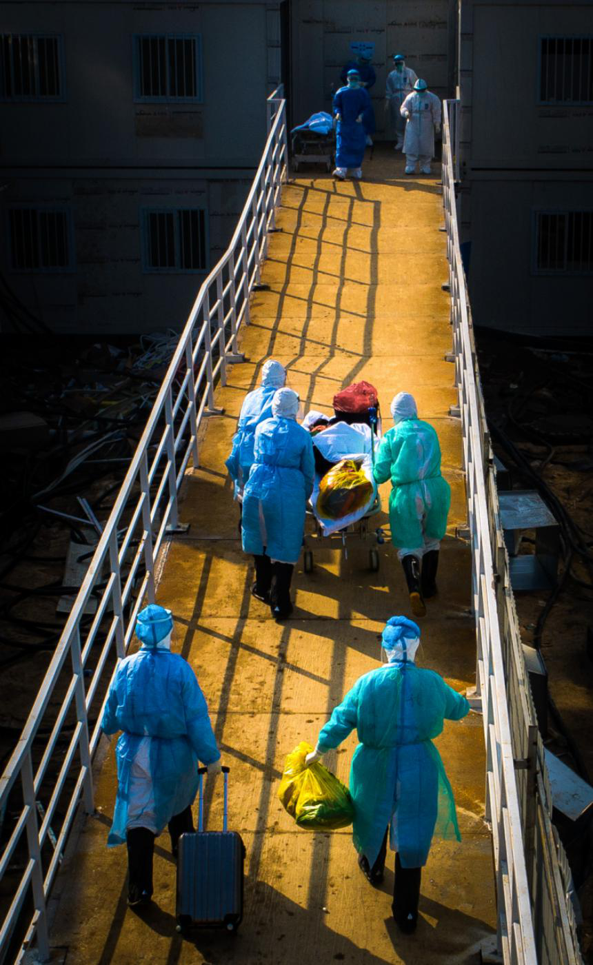 2月4日,醫(yī)護人員將患者轉運至武漢火神山醫(yī)院病房(無人機照片)。新華社記者 肖藝九/攝