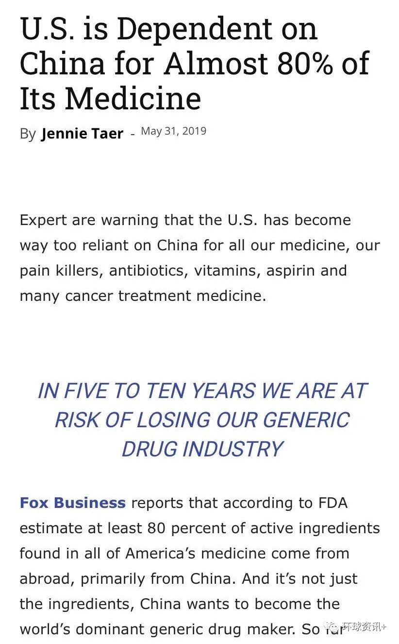 美國(guó)也不乏類(lèi)似“脫鉤”的言論。美國(guó)國(guó)會(huì)眾議院外交事務(wù)委員會(huì)共和黨議員麥考爾曾在一年前表示,要審視美國(guó)的供應(yīng)鏈,美國(guó)80%的藥品原料供應(yīng)來(lái)自中國(guó)。