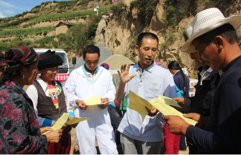 甘肅省舟曲縣東山鎮(zhèn)謝家村的謝村選(左四)為村民介紹養(yǎng)雞技術。