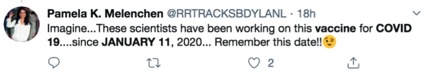 網(wǎng)民Pamela K.Melenchen稱,“想想看,這些科學(xué)家從1月11日就開始進(jìn)行疫苗研發(fā)了,請記住這個日期!”↓↓↓