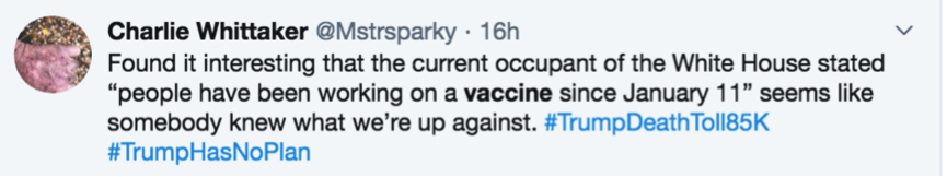 科學(xué)家查理·惠特克(Charlie Whittaker)稱:“總統(tǒng)說人們自從1月11日就開始研發(fā)疫苗,這真的很有趣,似乎有人早就知道我們面對的是什么。”↓↓↓