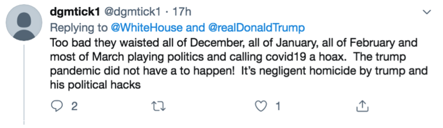 網(wǎng)民dgmtick1表示 :“糟糕的是,政客們浪費(fèi)了整個12月、1月、2月以及3月份大多數(shù)時間來玩他們的政治游戲,還居然稱新冠病毒是場騙局。這是特朗普和他的政客們的過失殺人行為!薄