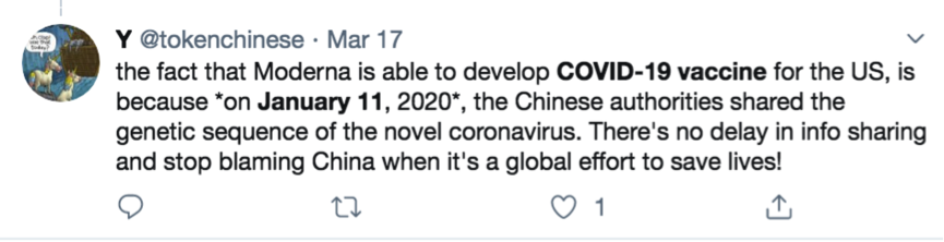 網(wǎng)民Y表示:“事實(shí)上生物制藥公司Moderna有能力為美國進(jìn)行新冠病毒疫苗研發(fā),因?yàn)槭加凇?月11日’,以及中國政府及時分享了基因序列。這就說明信息共享不存在延遲,再也不要指責(zé)中國說沒有及時共享信息了,現(xiàn)在需要全球努力去救治生命!”↓↓↓