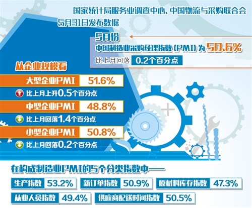 5月31日,國家統(tǒng)計局服務(wù)業(yè)調(diào)查中心和中國物流與采購聯(lián)合會發(fā)布了中國采購經(jīng)理指數(shù)。5月份,制造業(yè)采購經(jīng)理指數(shù)(PMI)和非制造業(yè)商務(wù)活動指數(shù)均保持在臨界點(diǎn)以上。其中,制造業(yè)采購經(jīng)理指數(shù)為50.6%,非制造業(yè)商務(wù)活動指數(shù)為53.6%。綜合PMI產(chǎn)出指數(shù)為53.4%,與上月持平。