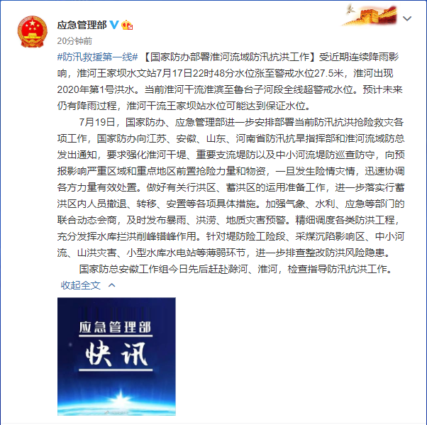 7月19日,國(guó)家防辦、應(yīng)急管理部進(jìn)一步安排部署當(dāng)前防汛抗洪搶險(xiǎn)救災(zāi)各項(xiàng)工作,國(guó)家防辦向江蘇、安徽、山東、河南省防汛抗旱指揮部和淮河流域防總發(fā)出通知,要求強(qiáng)化淮河干堤、重要支流堤防以及中小河流堤防巡查防守,向預(yù)報(bào)影響嚴(yán)重區(qū)域和重點(diǎn)地區(qū)前置搶險(xiǎn)力量和物資,一旦發(fā)生險(xiǎn)情災(zāi)情,迅速協(xié)調(diào)各方力量有效處置。做好有關(guān)行洪區(qū)、蓄洪區(qū)的運(yùn)用準(zhǔn)備工作,進(jìn)一步落實(shí)行蓄洪區(qū)內(nèi)人員撤退、轉(zhuǎn)移、安置等各項(xiàng)具體措施。加強(qiáng)氣象、水利、應(yīng)急等部門(mén)的聯(lián)合動(dòng)態(tài)會(huì)商,及時(shí)發(fā)布暴雨、洪澇、地質(zhì)災(zāi)害預(yù)警。精細(xì)調(diào)度各類(lèi)防洪工程,充分發(fā)揮水庫(kù)攔洪削峰錯(cuò)峰作用。針對(duì)堤防險(xiǎn)工險(xiǎn)段、采煤沉陷影響區(qū)、中小河流、山洪災(zāi)害、小型水庫(kù)水電站等薄弱環(huán)節(jié),進(jìn)一步排查整改防洪風(fēng)險(xiǎn)隱患。