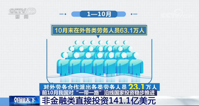 央視網(wǎng)消息:商務(wù)部昨天(19日)發(fā)布的數(shù)據(jù)顯示,今年前10月,我國(guó)企業(yè)對(duì)“一帶一路”沿線國(guó)家非金融類直接投資141.1億美元,同比增長(zhǎng)23.1%。