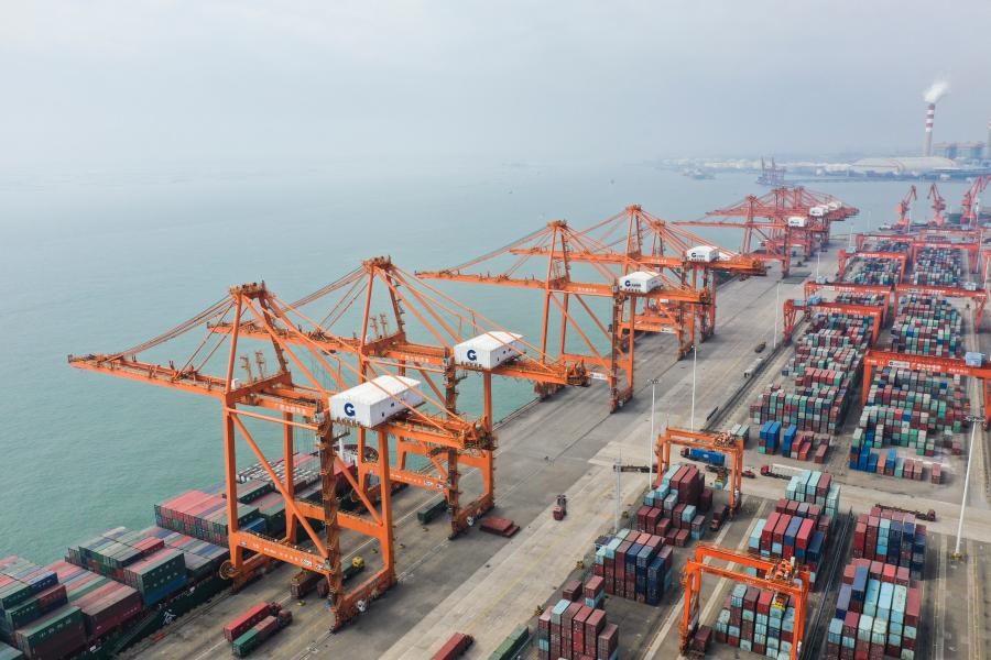 △這是中國(guó)(廣西)自由貿(mào)易試驗(yàn)區(qū)欽州港片區(qū)的集裝箱碼頭(2019年11月23日攝,無(wú)人機(jī)照片)。新華社記者 曹祎銘 攝