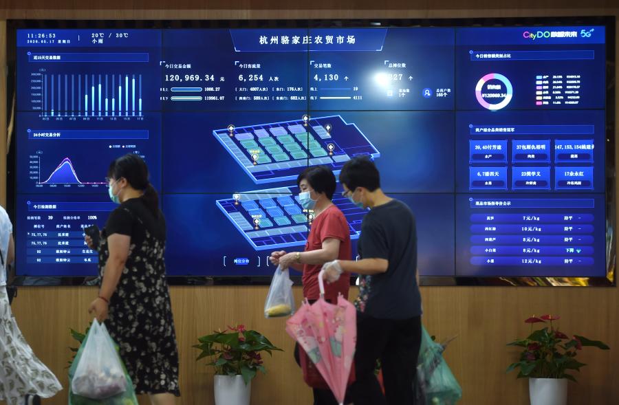 △浙江省杭州市的5G農(nóng)貿(mào)市場(chǎng)——駱家莊農(nóng)貿(mào)市場(chǎng)的大屏幕上實(shí)時(shí)顯示交易、客流等相關(guān)情況(2020年5月17日攝)。新華社記者 韓傳號(hào) 攝