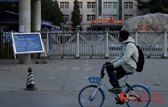 1月6日,石家莊市第六中學門口,擺放了校園封閉公告牌。 楊磊濤攝