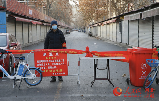 1月6日,志愿者在石家莊市橋西區(qū)西里南街市場門口值守,禁止所有人入內。 楊磊濤攝