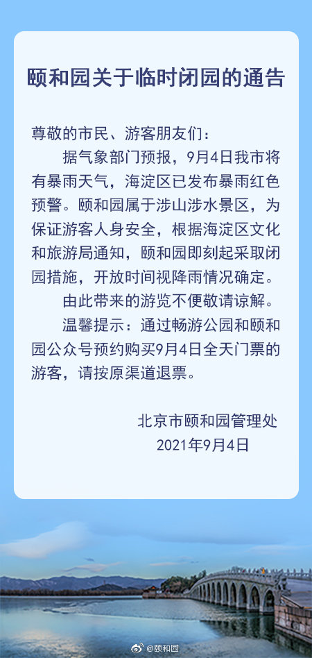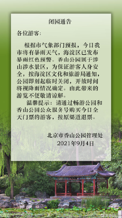 根據(jù)北京市氣象部門(mén)預(yù)報(bào),今日(4日)北京市將有暴雨天氣。頤和園、香山公園和北京植物園屬于涉山涉水景區(qū),為了保證游客人身安全,即刻起臨時(shí)關(guān)閉,開(kāi)放時(shí)間將視雨晴而定。