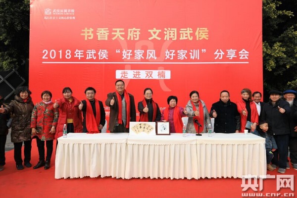 央廣網(wǎng)成都1月28日消息(記者韓民權)為踐行社會主義核心價值觀,使文化融入百姓生活。1月28日,由成都市武侯區(qū)圖書館主辦的“書香天府·文潤武侯‘好家風·好家訓’分享會”第二站在成都武侯區(qū)雙楠街道舉行,將多彩的文化活動送到了百姓身邊。當天,分享嘉賓與市民代表們分享了自己的好家風故事,并將優(yōu)秀的家風、家訓存入了“家風銀行”。