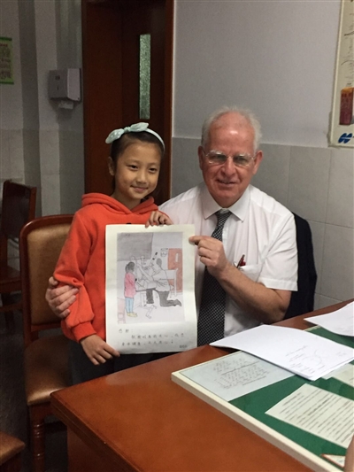 2016年秋天,英國(guó)牛津大學(xué)教授Peter單膝跪地為德陽(yáng)女孩星星(化名)檢查眼睛,星星媽媽瞬間感動(dòng)并拍下這一幕。今年秋天,Peter教授再次來(lái)到德陽(yáng)義診,星星按照媽媽拍下的照片畫了一幅畫送給Peter。教授很喜歡這幅畫,再三叮囑助手不要將畫弄皺了。10月24日,Peter帶著這幅畫離開德陽(yáng),他說(shuō)要把這幅畫帶回英國(guó)裱起來(lái),明年?duì)幦≡賮?lái)德陽(yáng)。