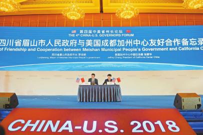相聚 第四屆中美省州長論壇上,兩國各地嘉賓相聚成都。本版圖片由 本報(bào)記者 郝飛 攝 相約 眉山市政府與美國加州中心簽署友好合作備忘錄,相約共建眉山加州智慧小鎮(zhèn)。相談 中美企業(yè)代表洽談合作。