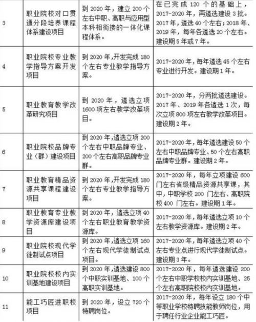 提升計(jì)劃包括六大建設(shè)內(nèi)容,17項(xiàng)建設(shè)任務(wù)。六大建設(shè)內(nèi)容包括加強(qiáng)高水平職業(yè)院校建設(shè),推進(jìn)品牌專(zhuān)業(yè)(群)建設(shè),深化專(zhuān)業(yè)課程體系改革,完善產(chǎn)教深度融合校企協(xié)同育人機(jī)制,強(qiáng)化“雙師型”教師隊(duì)伍建設(shè),推動(dòng)職業(yè)院校文化育人工作創(chuàng)新等。17項(xiàng)建設(shè)任務(wù)以2020年為目標(biāo)年份,提出了具體的建設(shè)目標(biāo)。根據(jù)各項(xiàng)目推進(jìn)程度不同,建設(shè)期不等。其中,職業(yè)院校對(duì)口貫通分段培養(yǎng)課程體系建設(shè)項(xiàng)目建設(shè)期較長(zhǎng),為5年或7年;職業(yè)院校專(zhuān)業(yè)教學(xué)指導(dǎo)方案開(kāi)發(fā)項(xiàng)目、職業(yè)教育精品資源共享課程建設(shè)項(xiàng)目則只需1年建設(shè)期。