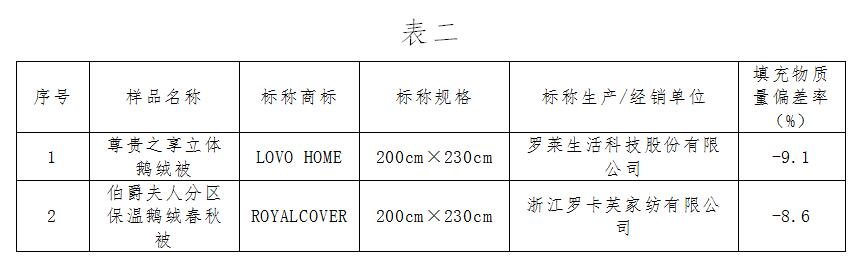 此外,鵝絨填充量的多少,也會直接影響到羽絨被的保暖程度。本次比較試驗的30件樣品中,2件樣品充絨量表現(xiàn)良好,偏差率高于–1%;26件樣品偏差率在-5%至-1%之間(含-5%和-1%);2件樣品的表現(xiàn)較差,偏差率低于–5%(詳見表二)。