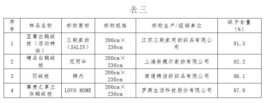 在充絨量相同的情況下,羽絨被的絨子含量越高其保暖性也越好。絨子含量是指絨子在羽絨填充物中的含量百分比。按照相關(guān)行業(yè)標(biāo)準(zhǔn)要求,絨子含量允許有5%的負(fù)偏差。本次比較試驗的30件樣品均標(biāo)稱絨子含量(或含絨量)達(dá)到95%,測試結(jié)果顯示絨子含量最高為94.4%,最低為81.3%。其中26件樣品的絨子含量大于90%,4件樣品絨子含量較低(詳見表三)。