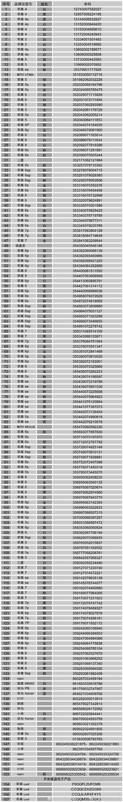 據(jù)新民網(wǎng)消息 5月初,上海虹口公安分局圍捕了一個集扒竊、轉(zhuǎn)贓、銷贓一體的犯罪團伙,繳獲大量手機。目前還有150多部手機及電子產(chǎn)品因沒報案而無人認領(lǐng),現(xiàn)在公布品牌型號及串碼。如發(fā)現(xiàn)自己手機,請于周一至周五8:30—17:30撥打電話:63098201,聯(lián)系李警官、王警官。