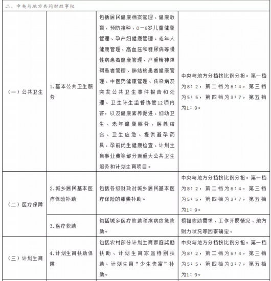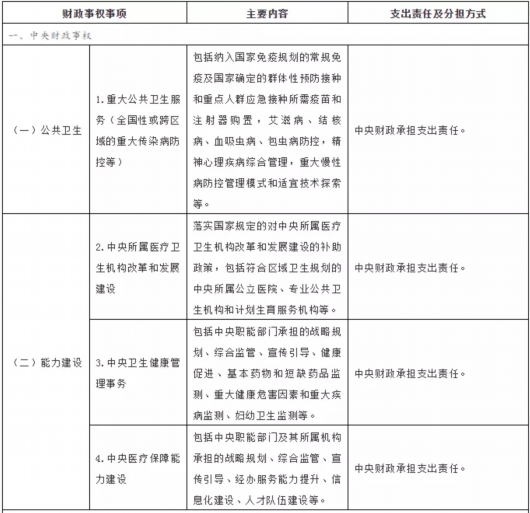《方案》明確,按照實(shí)施《“健康中國(guó)2030”規(guī)劃綱要》、深化醫(yī)藥衛(wèi)生體制改革的總體要求,從公共衛(wèi)生、醫(yī)療保障、計(jì)劃生育、能力建設(shè)四個(gè)方面劃分醫(yī)療衛(wèi)生領(lǐng)域中央與地方財(cái)政事權(quán)和支出責(zé)任。