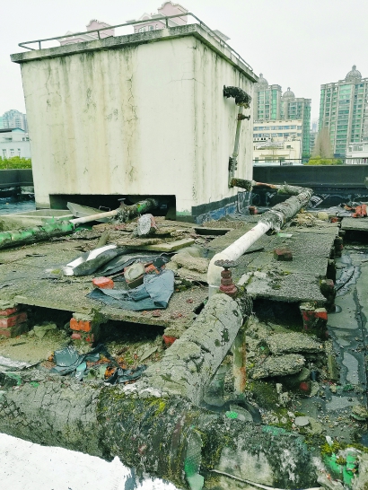 43號三樓85歲的應先生說,他住的朝北房間多年滲水,室內(nèi)十分潮濕。記者走進44號六樓兩戶業(yè)主家,室內(nèi)墻面多處發(fā)黑霉變,有的還豁裂、脫落。44號楊女士告訴記者,自來水內(nèi)經(jīng)常有粉塵,水色混濁。記者爬上43號、44號樓頂,清晰可見四周其他售后公房全已“平改坡”,而43號—46號兩幢樓沒有改造。44號樓頂水箱、水管及設施似廢棄多年,隔熱層多見破裂,碎磚殘瓦、破布等垃圾遍地。