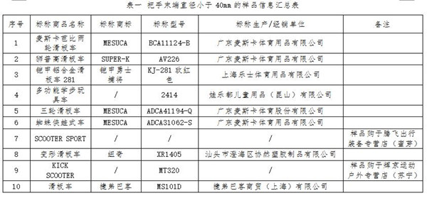 測試結(jié)果顯示,10件樣品把手末端直徑小于40mm把手橫管是兒童滑板車上較為明顯的突出部件,為避免滑板車在騎行中意外側(cè)翻時,把手砸傷使用者或第三者的腳面及身體其他部位,把手末端不應(yīng)太過尖細。標準要求,兒童滑板車把手末端的直徑不應(yīng)小于40mm。測試結(jié)果顯示,有10件樣品把手末端的直徑小于40mm(見表一)。