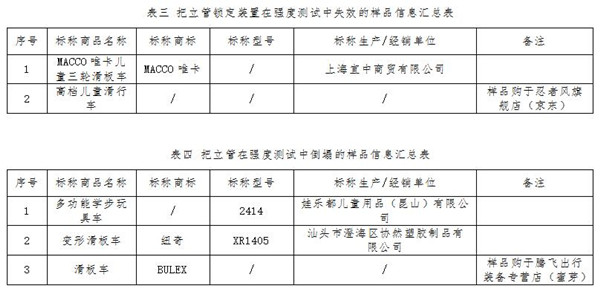 同時標準還要求,兒童滑板車不論其適用年齡大小、最大承重多少,把立管都要經(jīng)受垂直方向100kg持續(xù)5分鐘的強度測試,在測試中把立管不能倒塌、斷裂,鎖定裝置不能損壞或失效。結(jié)果顯示,有2件樣品的把立管鎖定裝置在強度測試中失效導(dǎo)致把立管向下塌縮(見表三),3件樣品的把立管在強度測試中彎折倒塌(見表四)。