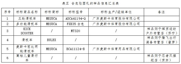 此外,有6件樣品含危險圓孔,7件樣品含危險夾手間隙。目前多數(shù)兒童滑板車都是可調(diào)節(jié)高度的,主要依靠把立管上的多個圓形定位孔來調(diào)節(jié)高度。如果把立管的壁很薄而且其上圓孔與兒童手指粗細差不多,則可能存在兒童手指伸入孔內(nèi)后被卡住的風(fēng)險。標準要求,兒童滑板車在任何厚度小于1.58mm的剛性材料上,深度不小于10mm的可觸及圓孔的直徑不應(yīng)在6-12mm之間。測試結(jié)果顯示,有6件樣品含有尺寸危險的圓孔(見表五),即在管壁厚度小于1.58mm處存在直徑在6-12mm之間且深度超過10mm的圓孔。