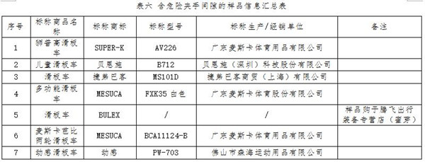 滑板車上活動最多的部件主要是車輪,車輪與車身支架之間均有一定間隙,這類間隙若與兒童手指粗細相當,則可能存在夾傷風(fēng)險。標準要求,兒童滑板車活動部件的可觸及間隙不應(yīng)在5-12mm之間。測試結(jié)果顯示,有7件樣品車輪周圍間隙在5-12mm之間(見表六)。