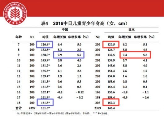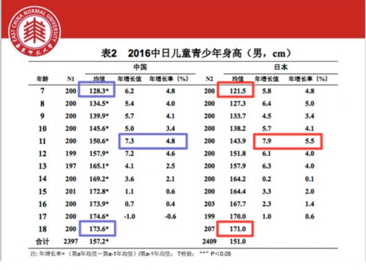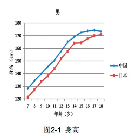 譬如,7-18歲中日兒童青少年(男)身高統(tǒng)計中,除12歲外,中國男生均顯著高于日本男生。中國女生各年齡段也均顯著高于日本女生。