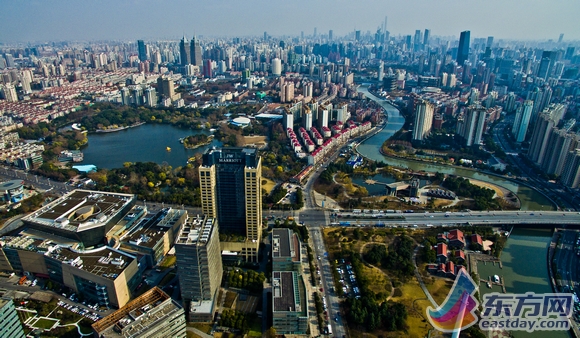圖片說明:航拍的上海長(zhǎng)風(fēng)公園。(鈕一新攝影)