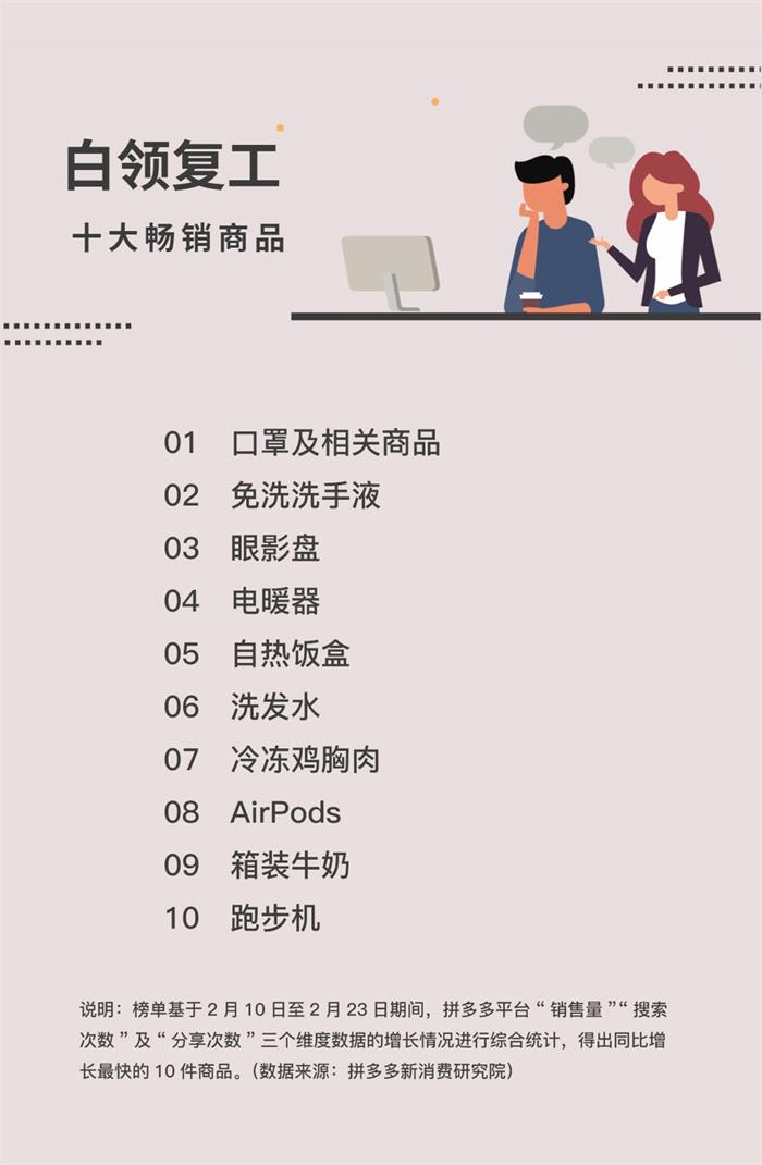 日前,拼多多對平臺消費數(shù)據(jù)尤其是三線以上復(fù)工密集城市的消費數(shù)據(jù)進(jìn)行了分析,得出“白領(lǐng)復(fù)工10大熱銷商品”榜單。其中,既有口罩及相關(guān)衍生品,又有自熱飯盒、眼影盤等解決吃和用的商品。