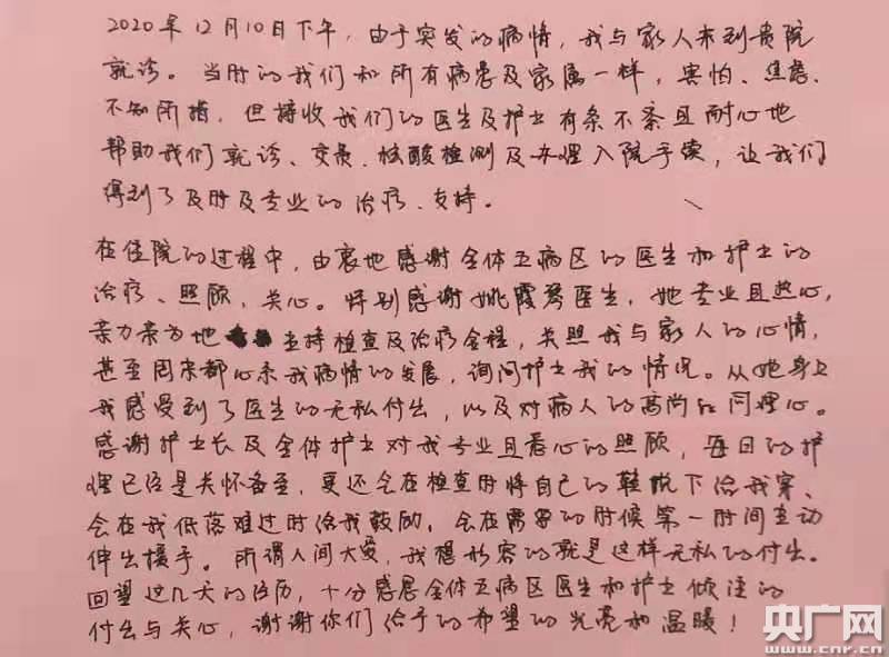 12月16日,一婦嬰西院產(chǎn)科五病區(qū)收到一封來自患者小妍(化名)的感謝信,言辭懇切!懊咳盏淖o理已經(jīng)是關懷備至,還會在檢查時將自己的鞋脫下來給我穿,會在我低落難過時給我鼓勵,會在需要的時候第一時間主動伸出援手。所謂人間大愛,我想形容的就是這樣無私的付出。”