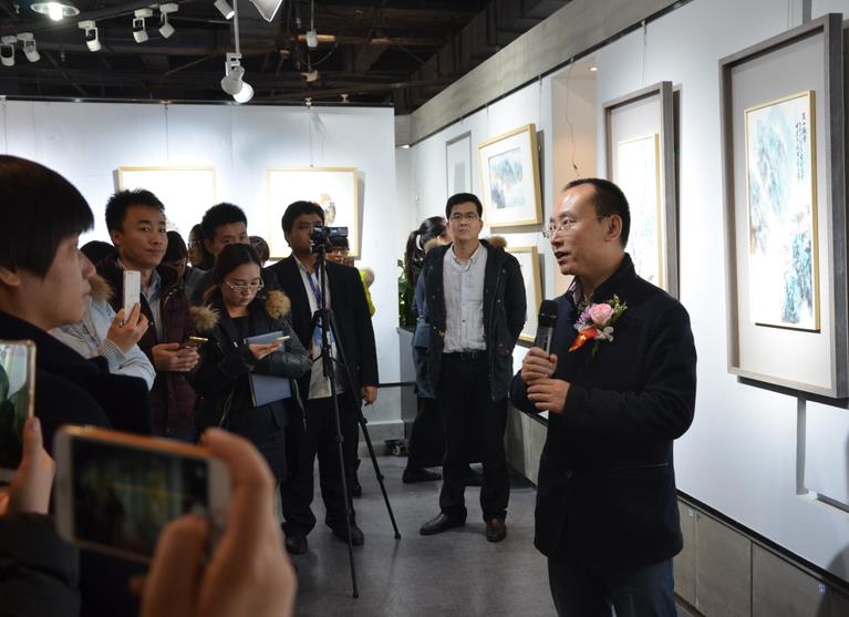 邵曉峰向現(xiàn)場參觀畫展的市民介紹中國潑彩山水畫
