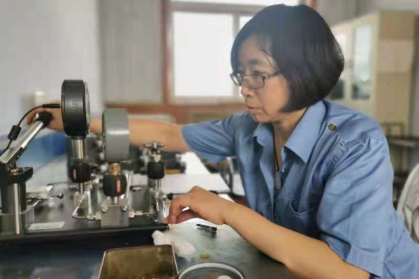 班組職工賈海霞工作經(jīng)驗(yàn)豐富,每月她檢定合格的鐵路專業(yè)壓力表有近200塊。靈巧的雙手,嫻熟的動作,一套拆卸、試驗(yàn)、記錄、清潔、粘貼標(biāo)識、施封等操作流程,在她手里顯得格外流暢。壓力表中的游絲松動、損壞,將直接導(dǎo)致指針產(chǎn)生位移。重新整理纖細(xì)的游絲也絲毫難不倒賈海霞,她拆開表盤,一手扶穩(wěn)表身,一手拿著鑷鉗,小心翼翼地夾住游絲,一拎一壓一推一轉(zhuǎn),游絲就乖乖地在表盤里均勻地盤成圈,整個過程手絲毫不見抖動。班組剛來的職工問她盤游絲的秘訣時,她總是說:“也沒什么秘訣,就是個手感,多練練就會了。”