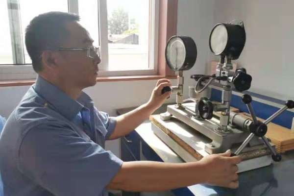 計(jì)量檢定員正在進(jìn)行鐵路雙針壓力表的校驗(yàn)(太原車輛段供圖)