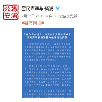 據(jù)上海市公安局楊浦分局官方微博消息,2月22日17時(shí)30分許,上海市公安局楊浦分局接群眾報(bào)警稱:有人在微信群中謾罵、污蔑南京大屠殺遇難者。接報(bào)后,楊浦警方高度重視,迅速開(kāi)展調(diào)查工作,民警隨即將涉案的孟某抓獲。2月23日,上海市公安局楊浦分局依法對(duì)孟某處以行政拘留處罰。